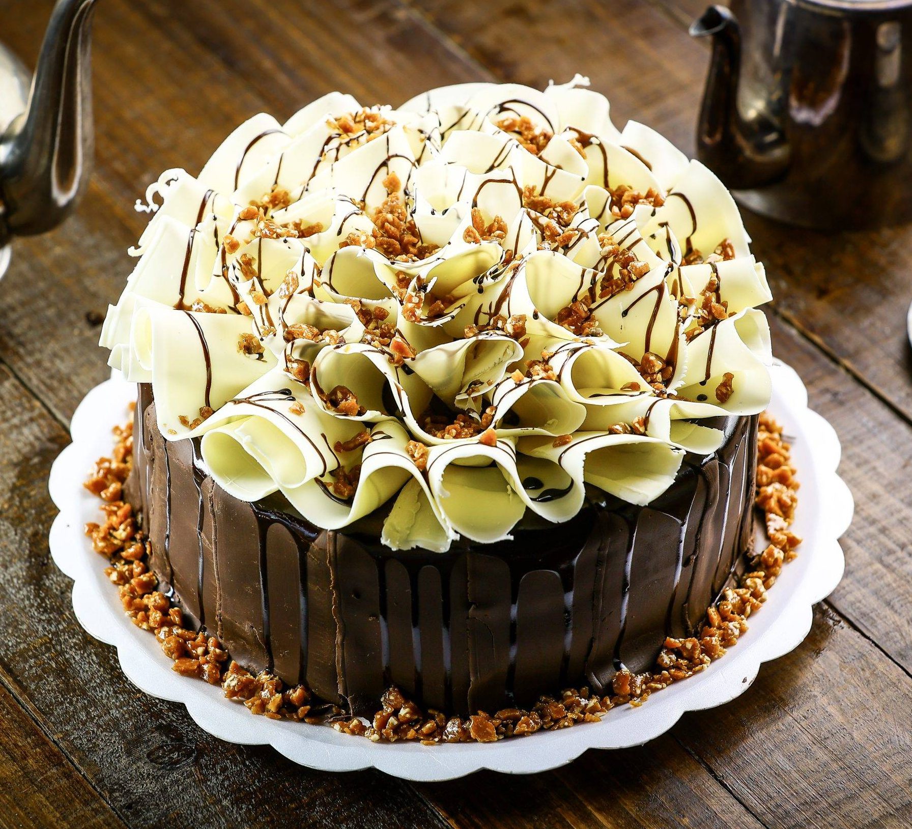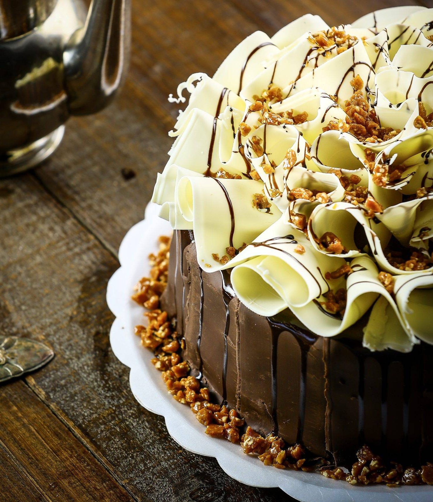 Bolo branco e de chocolate, brigadeiro preto e branco e crocante.