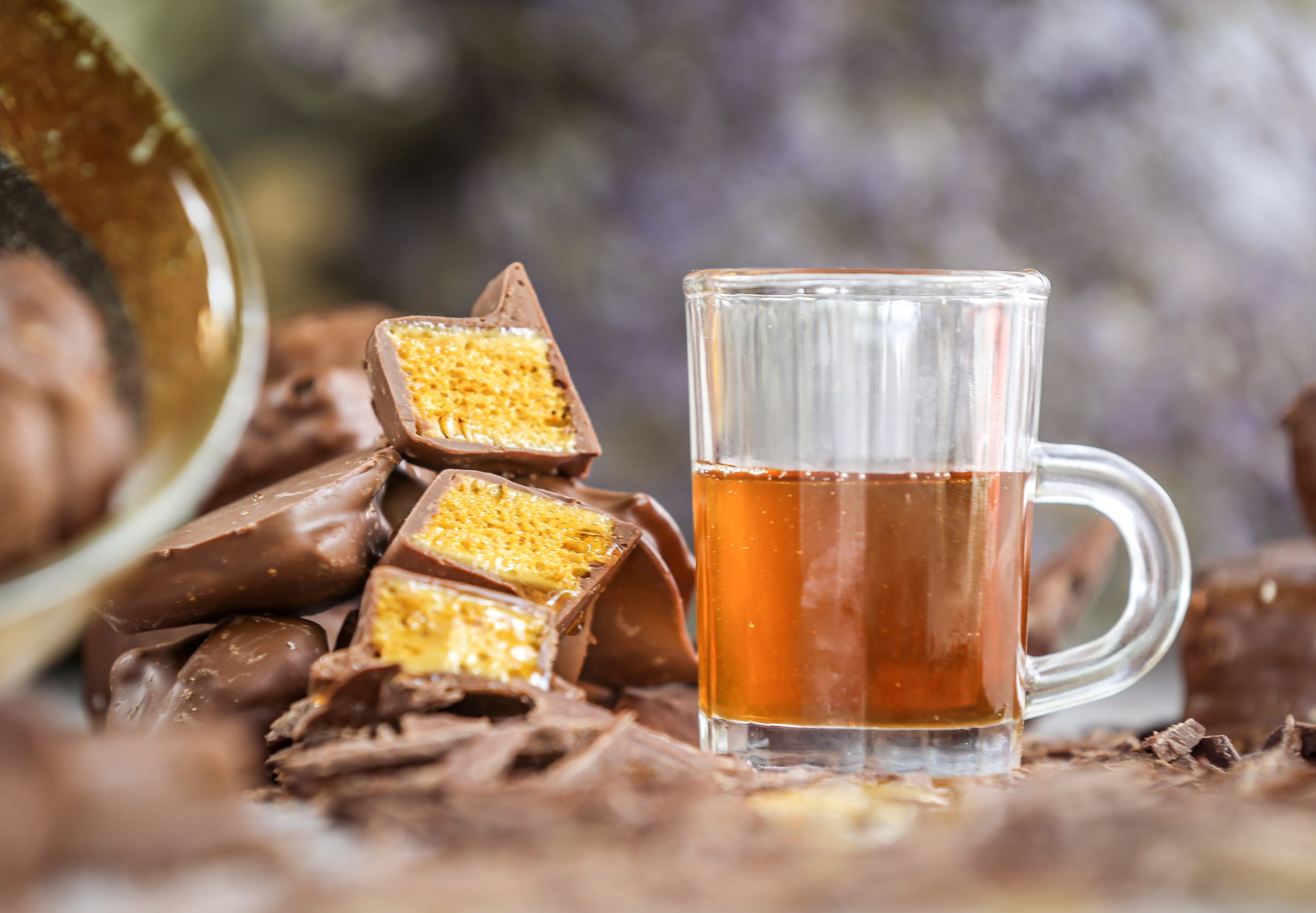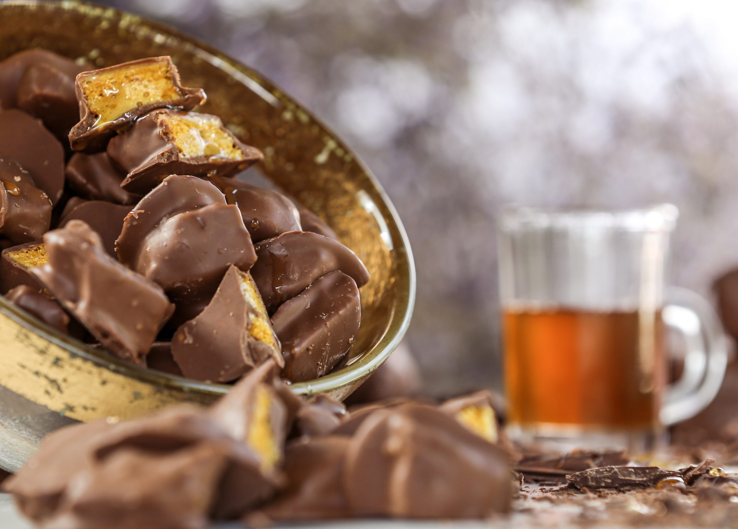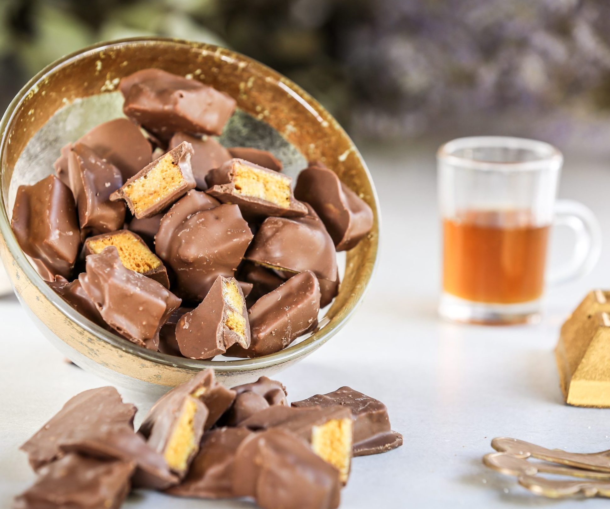 Pequenos favos crocantes de mel, com um toque ‘puxa” banhados em chocolate belga.