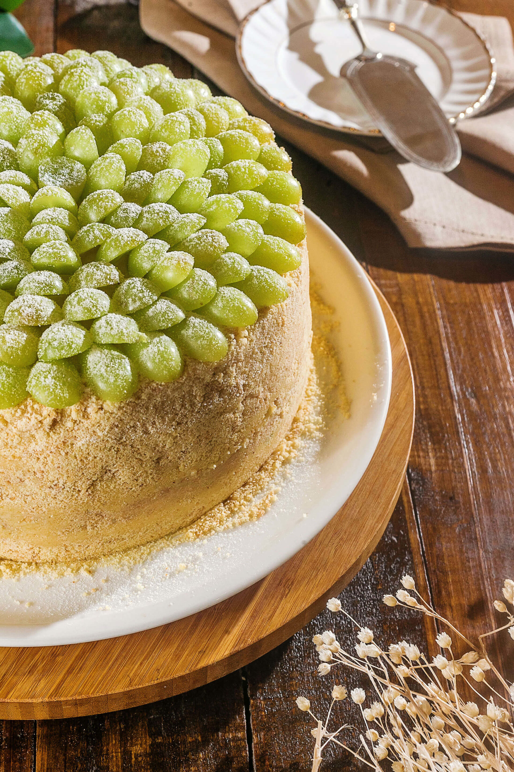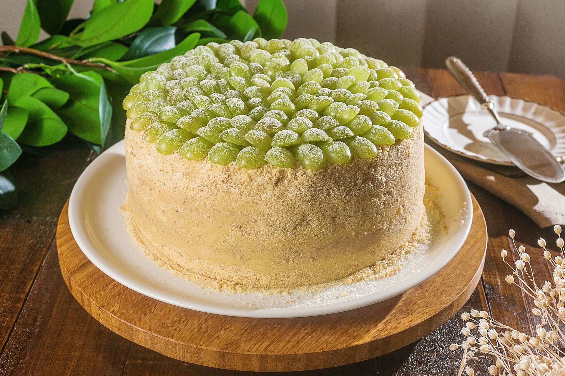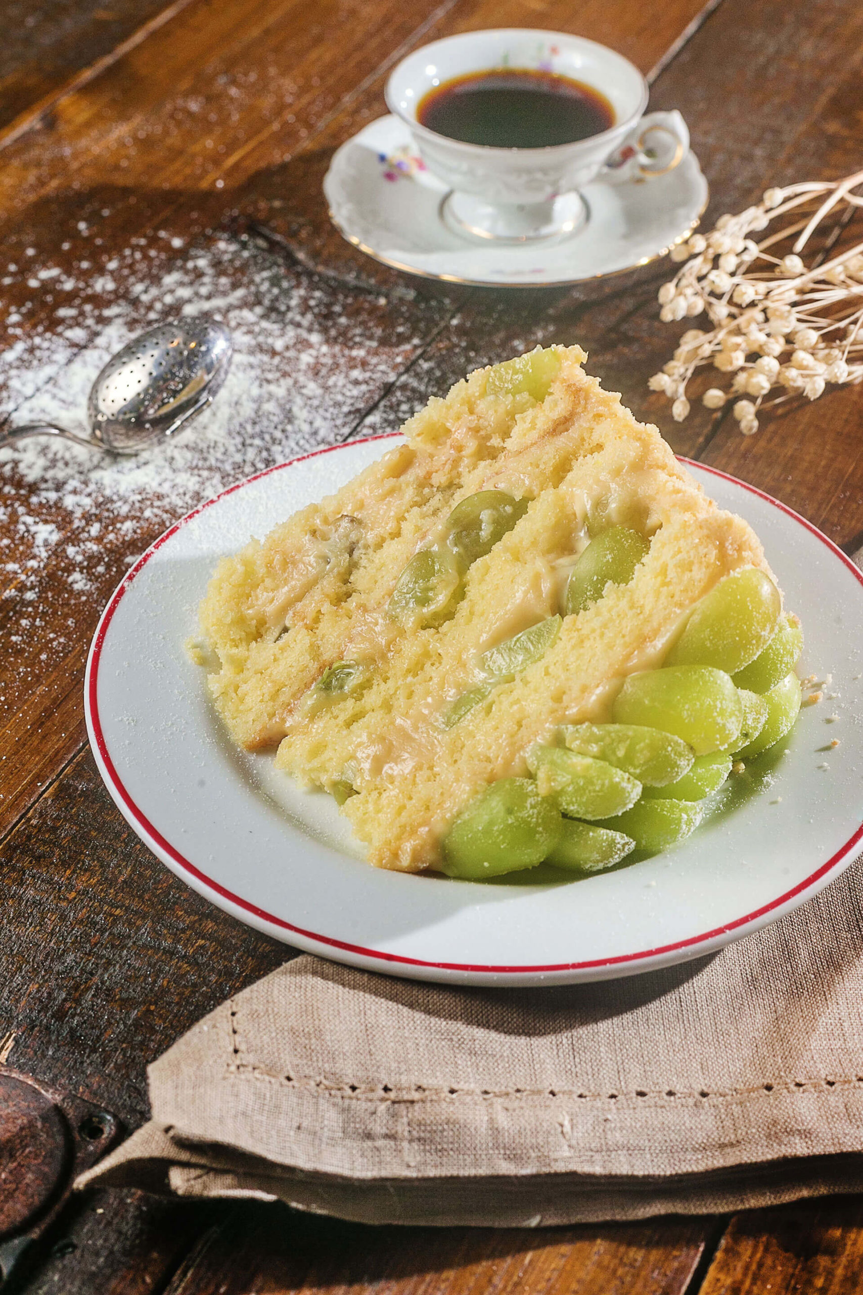 Pão de ló, brigadeiro de ninho e uvas verdes.