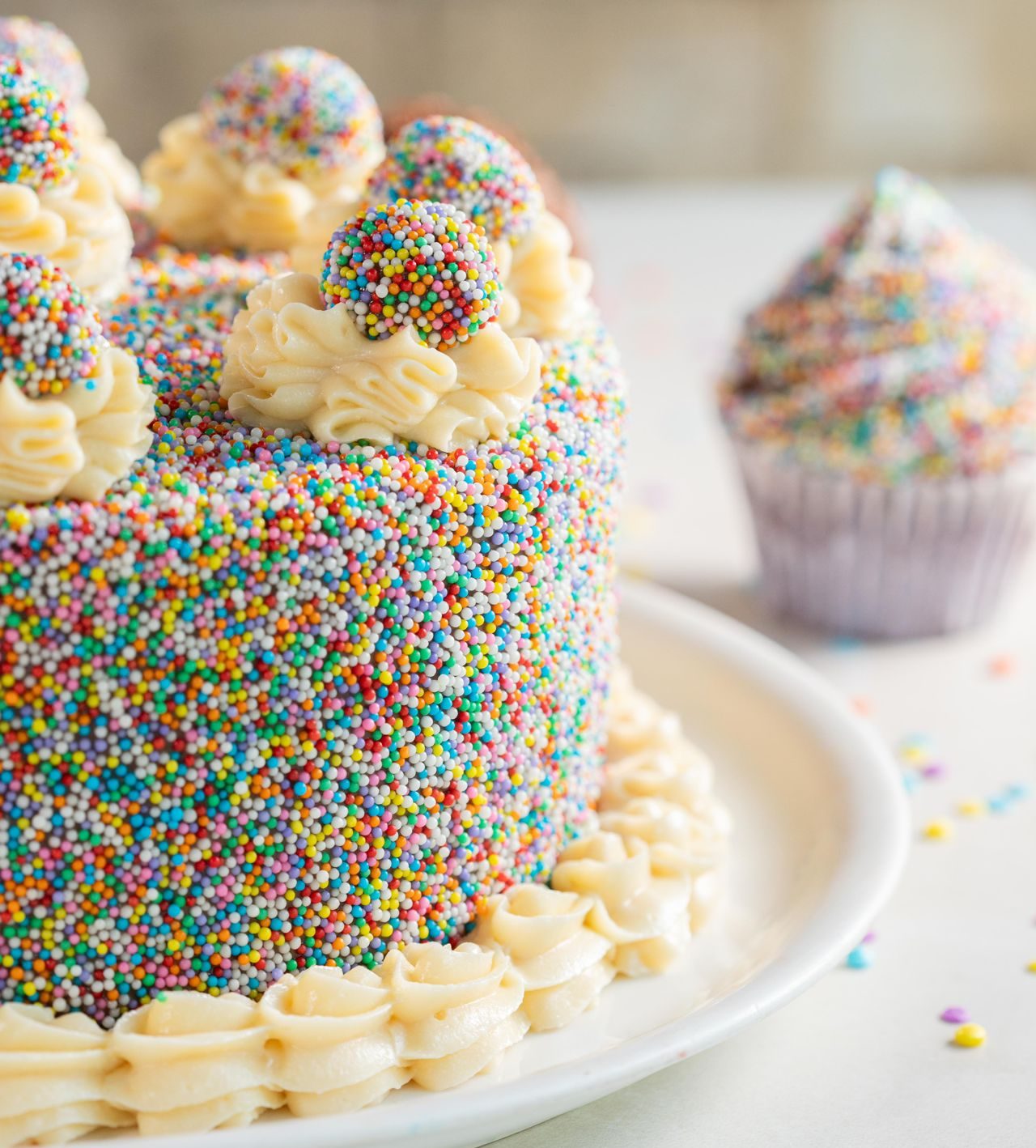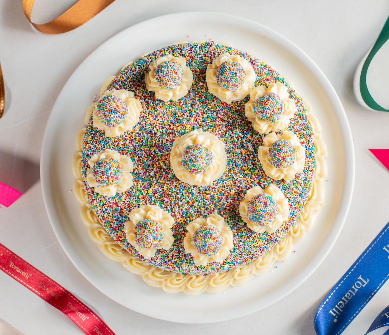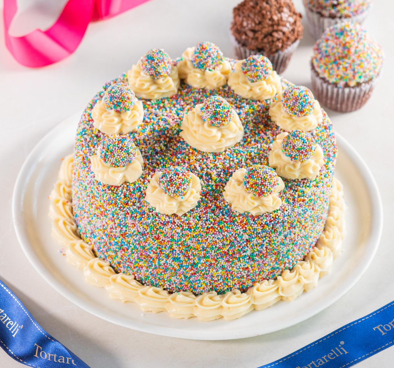 Bolo de chocolate, recheio de brigadeiro branco, brigadeiro de morango e brigadeiro de chocolate, coberta confeitos coloridos.
